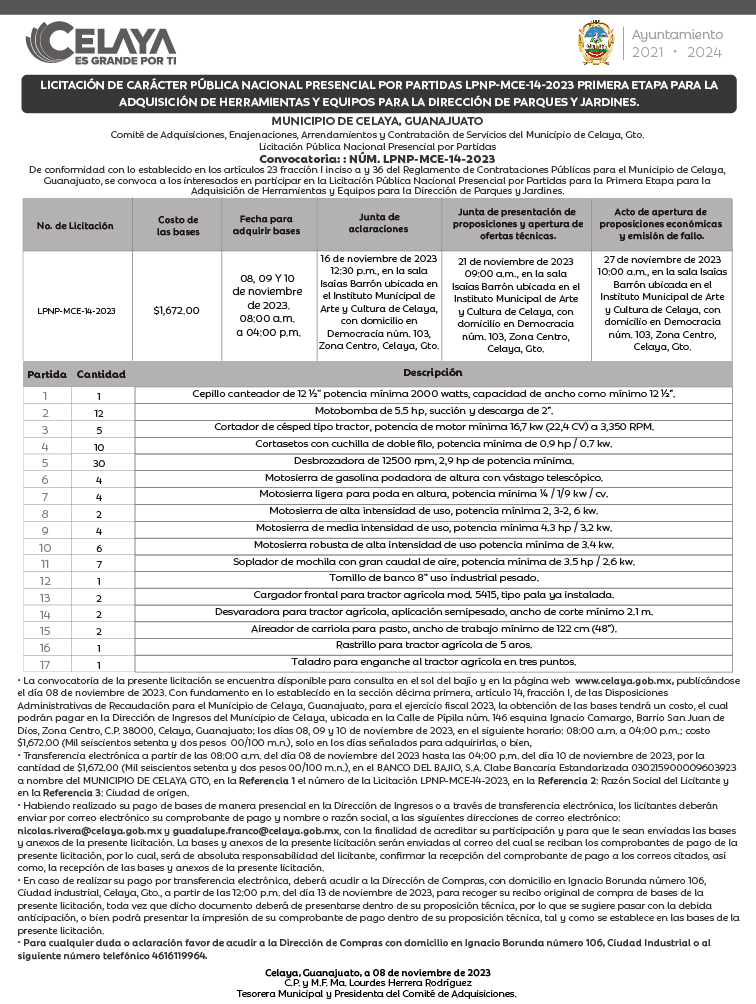LICITACIÓN DE CARÁCTER PÚBLICA NACIONAL PRESENCIAL POR PARTIDAS LPNP-MCE-14-2023 PRIMERA ETAPA PARA LA ADQUISICIÓN DE HERRAMIENTAS Y EQUIPOS PARA LA DIRECCIÓN DE PARQUES Y JARDINES.