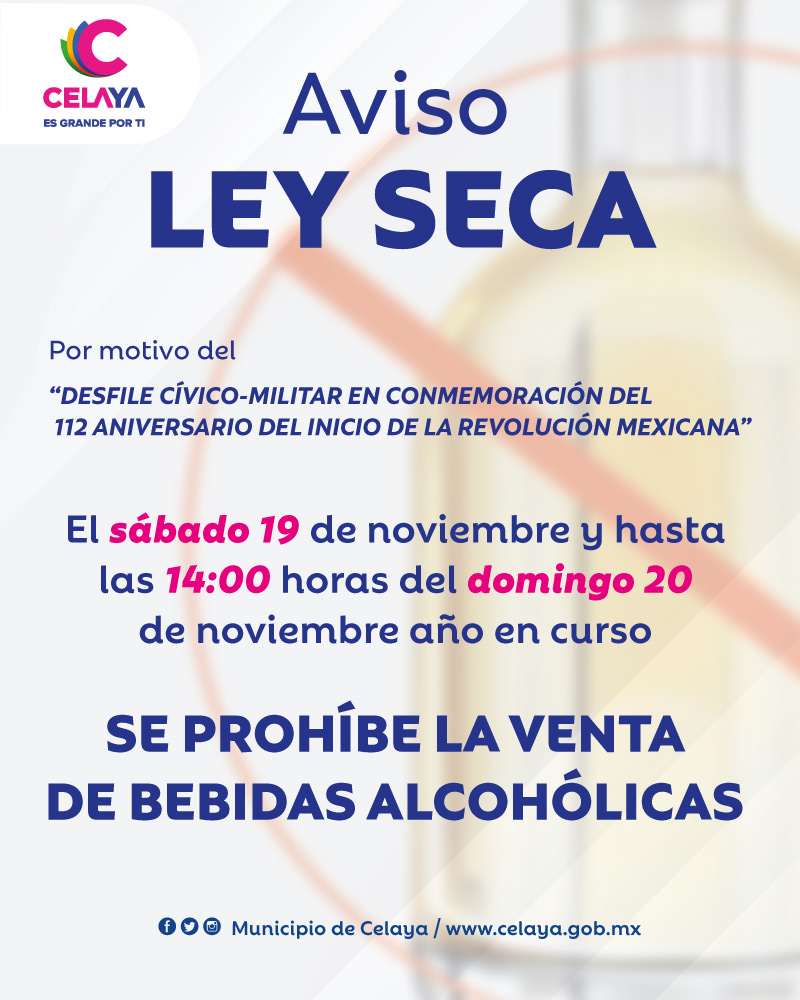 “SE PROHÍBE LA VENTA DE BEBIDAS ALCOHÓLICAS APARTIR DEL CIERRE DE LOS ESTABLECIMIENTOS EN LOS HORARIOS PERMITIDOS PARA SU FUNCIONAMIENTO DEL DÍA SÁBADO 19 DE NOVIEMBRE DEL AÑO EN CURSO Y HASTA LAS 14:00 HORAS DEL DÍA DOMINGO 20 DE NOVIEMBRE DEL PRESENTE AÑO.”