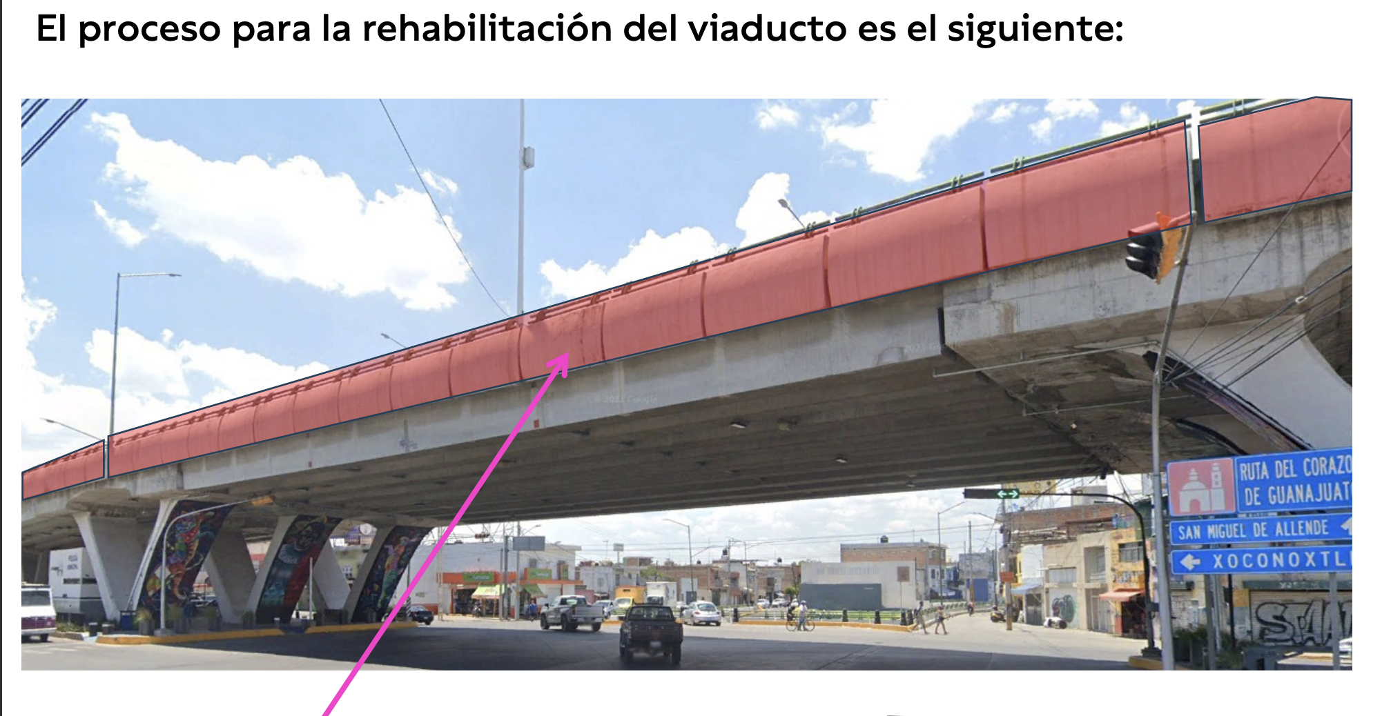 El director del Instituto Municipal de Investigación, Planeación y Estadística (IMIPE), Sergio Martínez León, expuso como antecedente que este paso a desnivel, conocido como el Puente de Constituyentes, fue construido en el 2005 con un total de 90 trabes y una extensión de 960 metros.