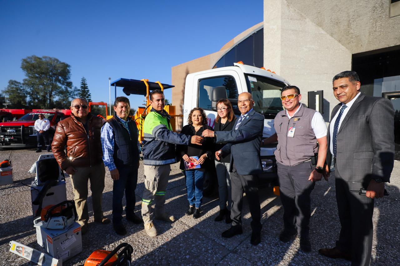 - El presidente municipal, Javier Mendoza Márquez, encabezó el evento donde se entregaron las 49 unidades y 94 herramientas, adquiridas con inversión de casi 51 MDP.