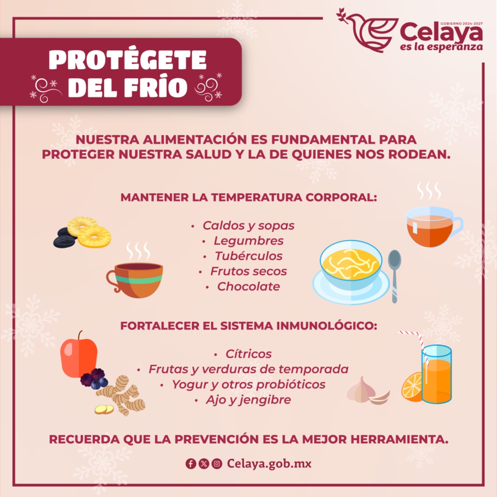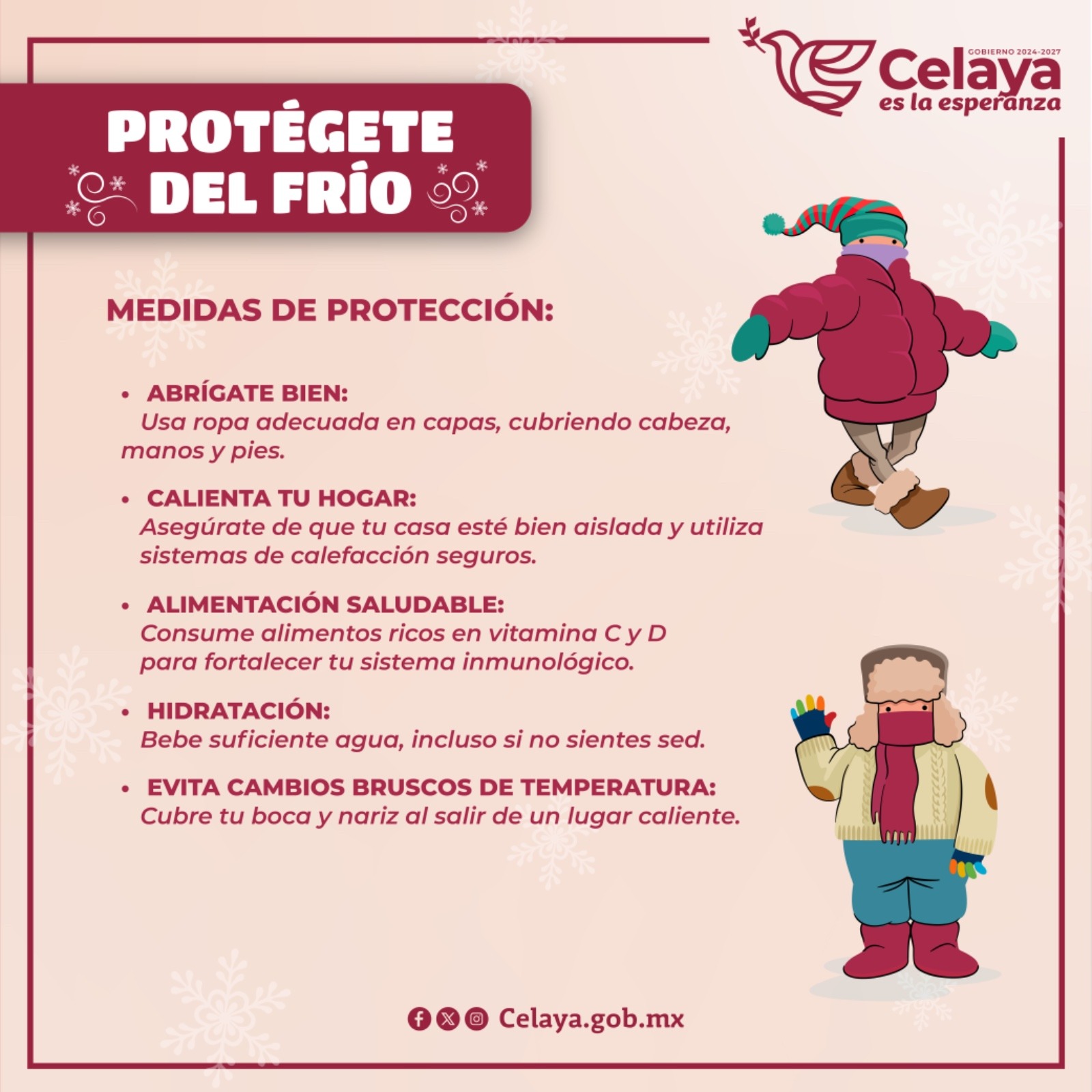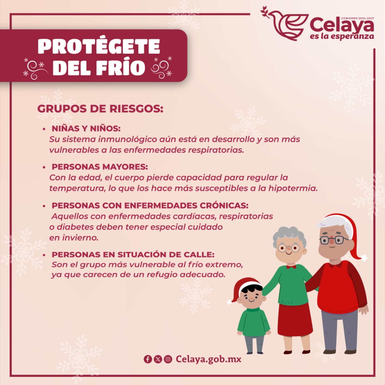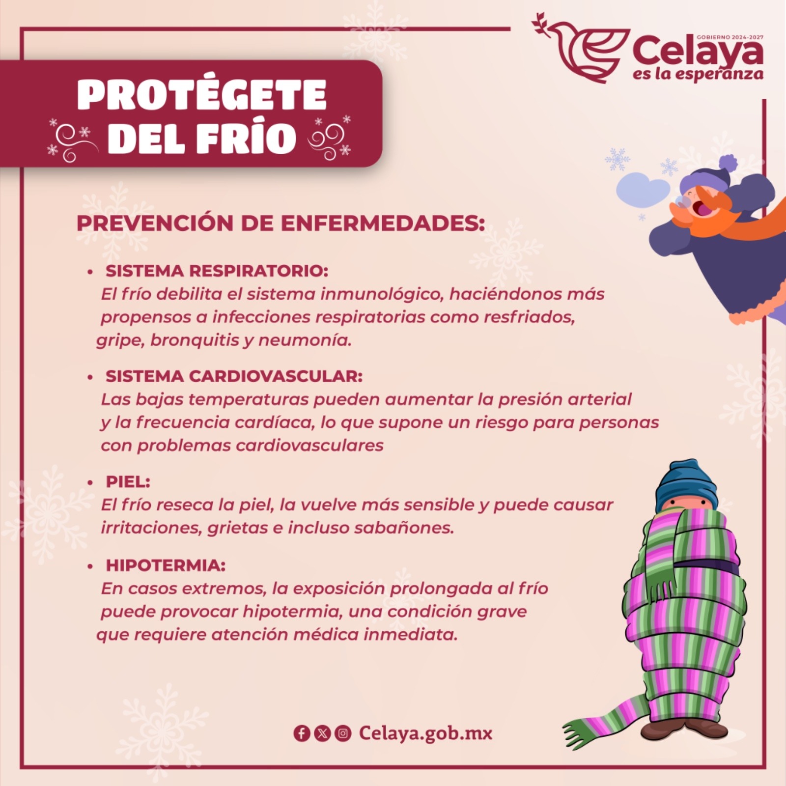 La Secretaría de Seguridad Ciudadana de Celaya (SSCC), a través de la Dirección de Protección Civil y Bomberos informa que, ante la llegada de la temporada invernal, se exhorta a la población extremar precauciones para cuidar su salud.