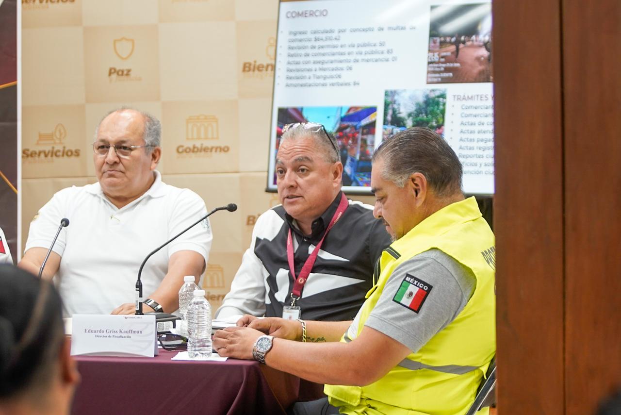 En su participación el director de Fiscalización, informó sobre sui participación en el retiro de 83 comerciantes, revisiones a mercados, tianguis; así como 67 actas y 84 amonestaciones verbales.