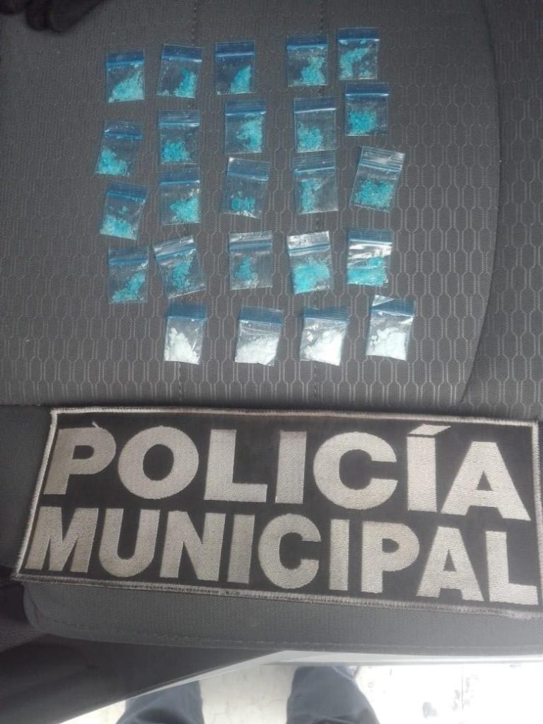 Al momento de ser detenido y revisado, se le encontró en posesión de 24 pequeñas bolsas de plástico, 20 de ellas con una sustancia de color azul con características del cristal y cuatro dosis de un polvo blanco con característica de la cocaína.