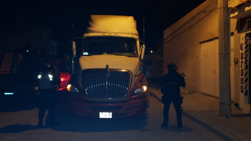 Mientras tanto se reportó al 911, el robo de un camión Freightliner Cascadia, modelo 2018, blanco, en las inmediaciones de la colonia Villas del Romeral, por lo que se realizó un dispositivo de búsqueda y que dio resultados positivos sobre la carretera a Salvatierra en la comunidad Santa Anita, donde fue recuperado.
