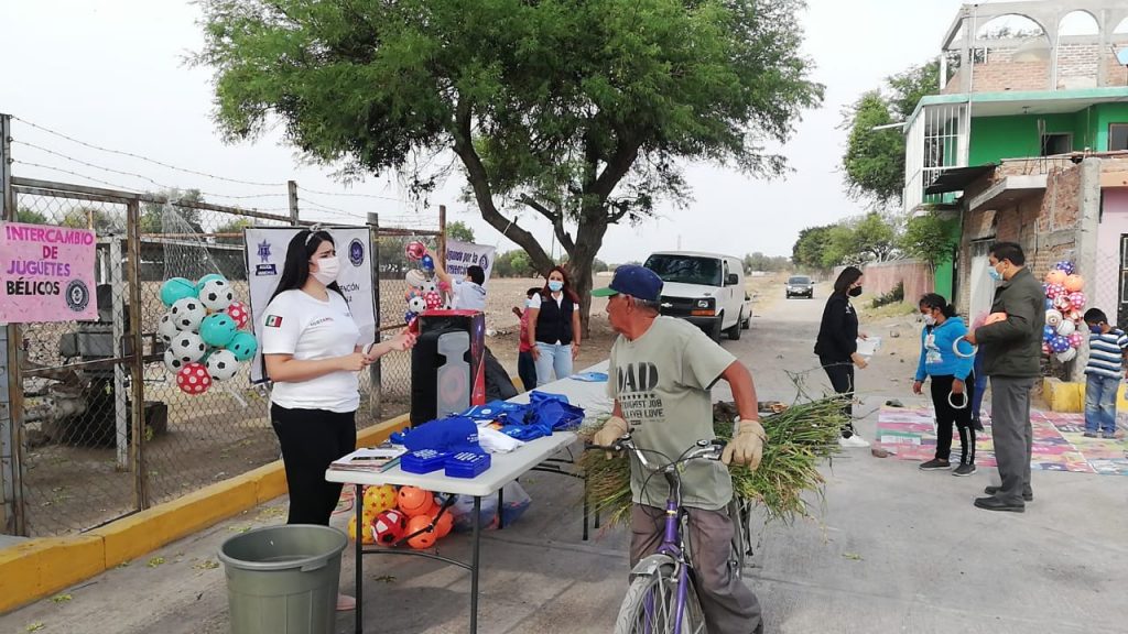 Así mismo se realizó el canje de juguetes bélicos en el Fraccionamiento Los Olivos, en la Herradura, Lagos, en la calle Morelos de la Zona Centro y Arboledas de San Rafael, además de las comunidades Santa Teresa, Plancarte, Gasca y San Martín de Camargo.