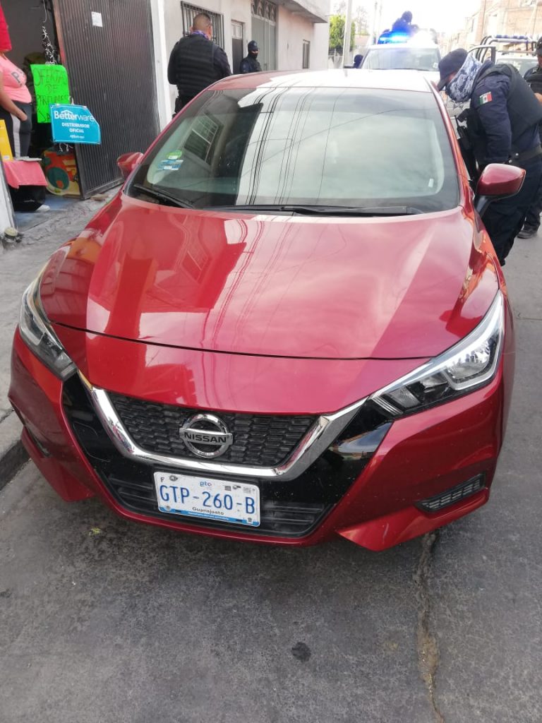 Así mismo en la calle Durazno y camino a Roque en la colonia El Paraíso, se localizó un taxi Nissan Versa, modelo 2020, color blanco con verde, el cual contaba con reporte de robo al 911.