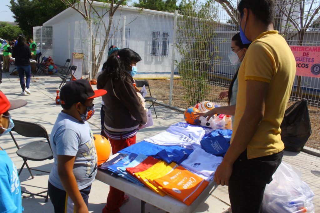 Con los diversos módulos, se realizó el canje por un artículo didáctico, playeras, envases para agua, mochilas, pelotas y juguetes deportivos como balones de futbol y basquetbol.